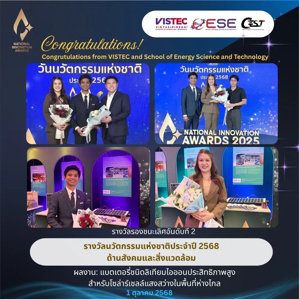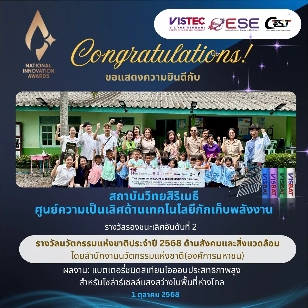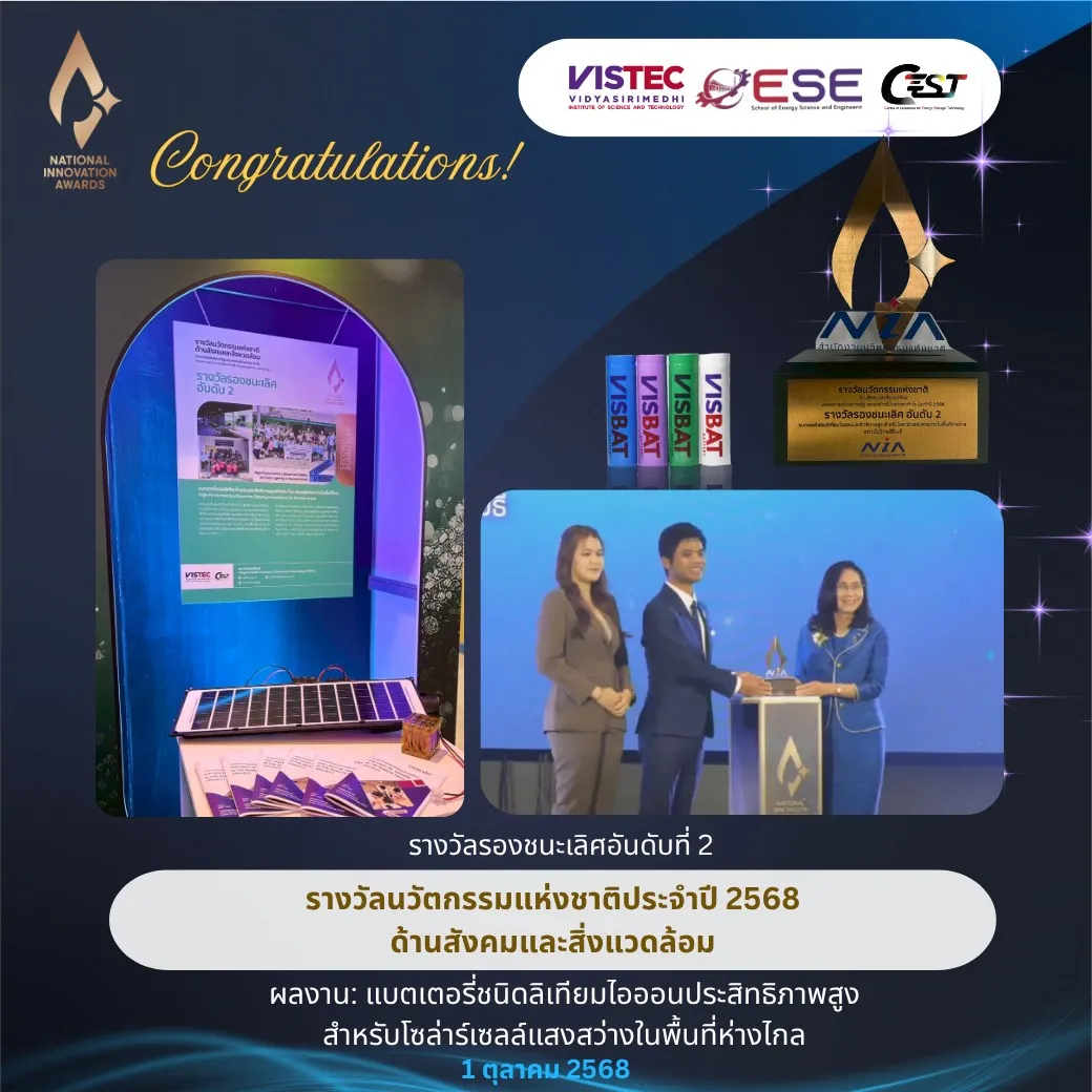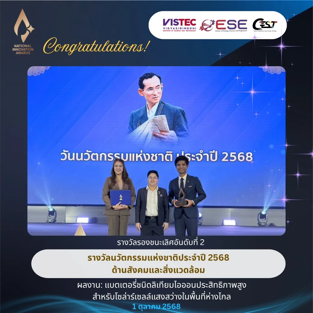 ขอแสดงความยินดีกับทีมนักวิจัยจากศูนย์ความเป็นเลิศด้านเทคโนโลยีกักเก็บพลังงาน สถาบันวิทยสิริเมธี ที่คว้ารางวัล รองชนะเลิศอันดับ 2 รางวัลนวัตกรรมแห่งชาติ ด้านสังคมและสิ่งแวดล้อม ประเภทองค์กรไม่แสวงหาผลกำไร ในการประกวด รางวัลนวัตกรรมแห่งชาติ ประจำปี 2568 เมื่อวันที่ 1 ตุลาคม 2568 ณ ห้องนภาลัย แกรนด์ บอลรูม โรงแรมดุสิตธานี กรุงเทพฯ ทีมนักวิจัยจากศูนย์ความเป็นเลิศด้านเทคโนโลยีกักเก็บพลังงาน ได้รับเกียรติขึ้นรับรางวัลรองชนะเลิศอันดับ 2 พร้อมโล่เกียรติยศและประกาศนียบัตร โดยการมอบรางวัลจัดขึ้นภายในงาน วันนวัตกรรมแห่งชาติ 2568 จัดโดยสำนักงานนวัตกรรมแห่งชาติ (องค์การมหาชน)