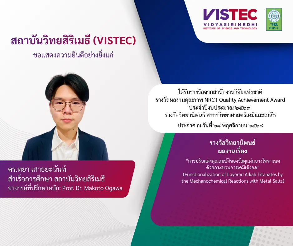 Award: รางวัลผลงานคุณภาพ NRCT Quality Achievement Award สาขาวิทยาศาสตร์เคมีและเภสัช ประจำปีงบประมาณ 2569