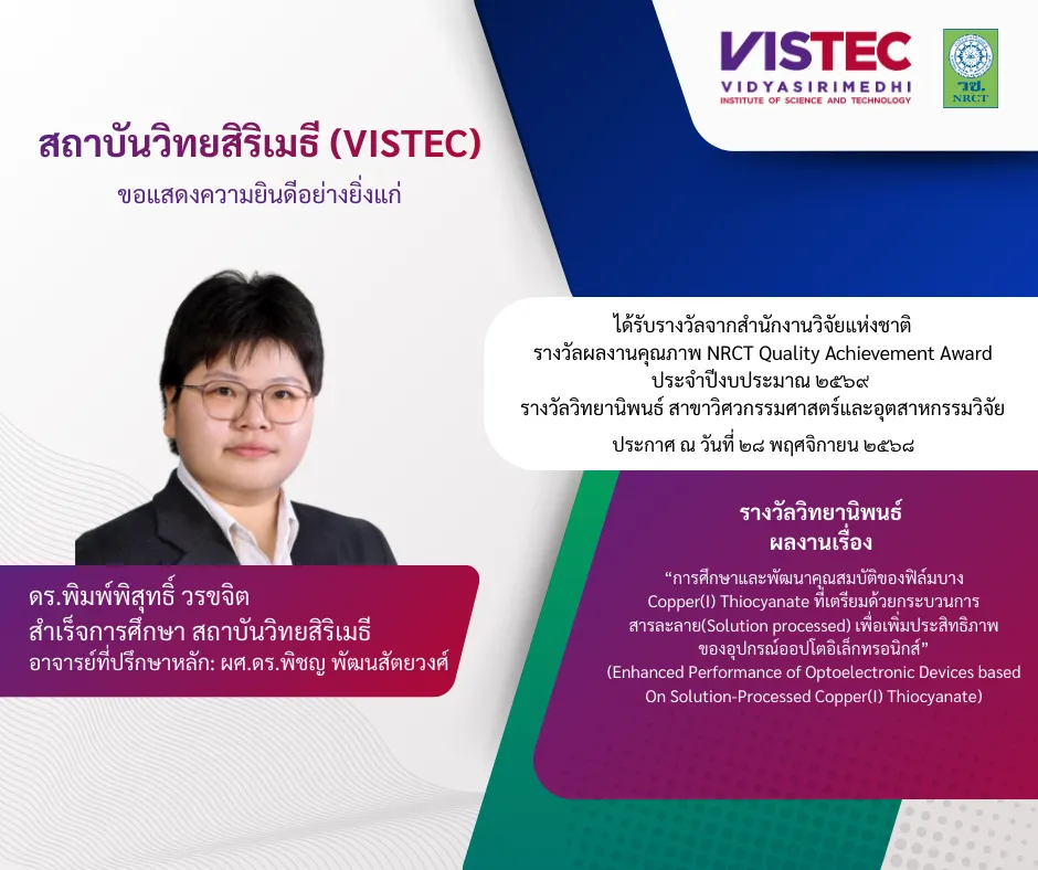 Award: รางวัลผลงานคุณภาพ NRCT Quality Achievement Award สาขาวิศวกรรมศาสตร์และอุตสาหกรรมวิจัย ประจำปีงบประมาณ 2569