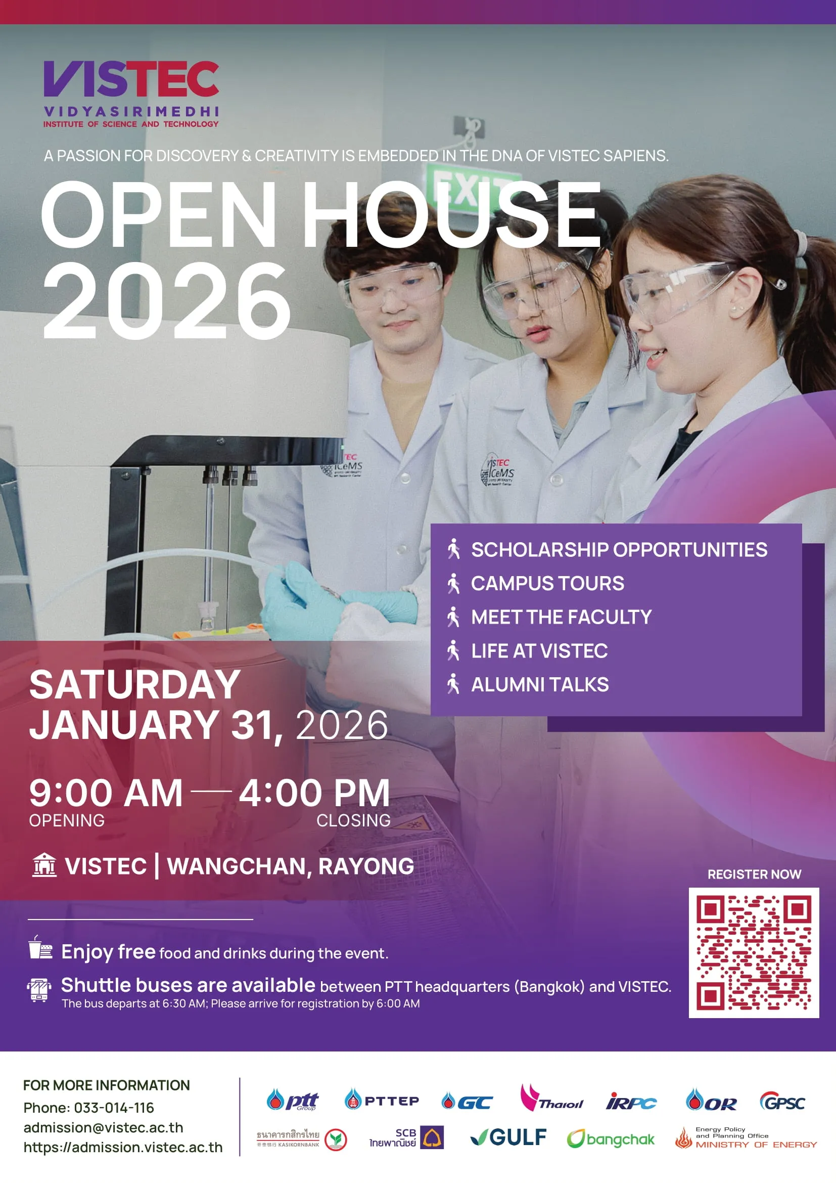 To help you get a firsthand look at VISTEC, we invite you to our VISTEC Open House 2026 on 31 January 2026. Itโs the perfect way to explore all that we have to offer, get firsthand information about our programs, scholarships, and campus, and ask questions directly to our faculty and students.